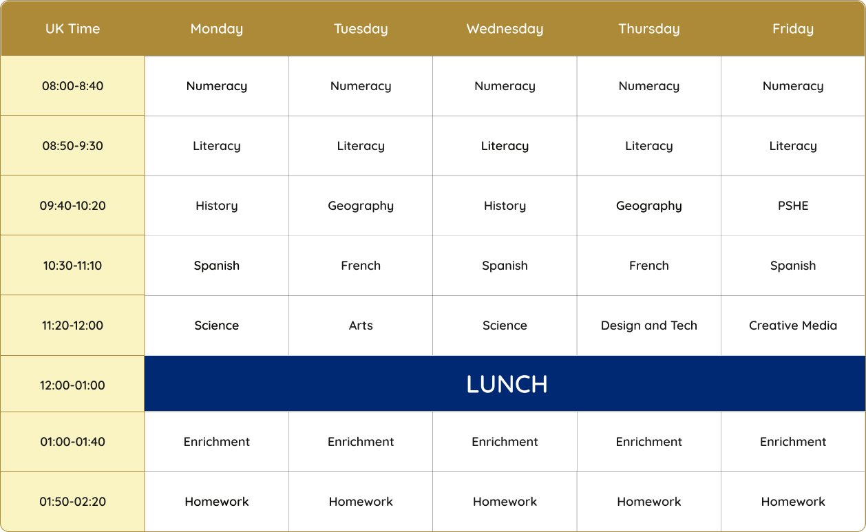 Our curriculum is aligned with the National Curriculum and we provide all learning materials online.
