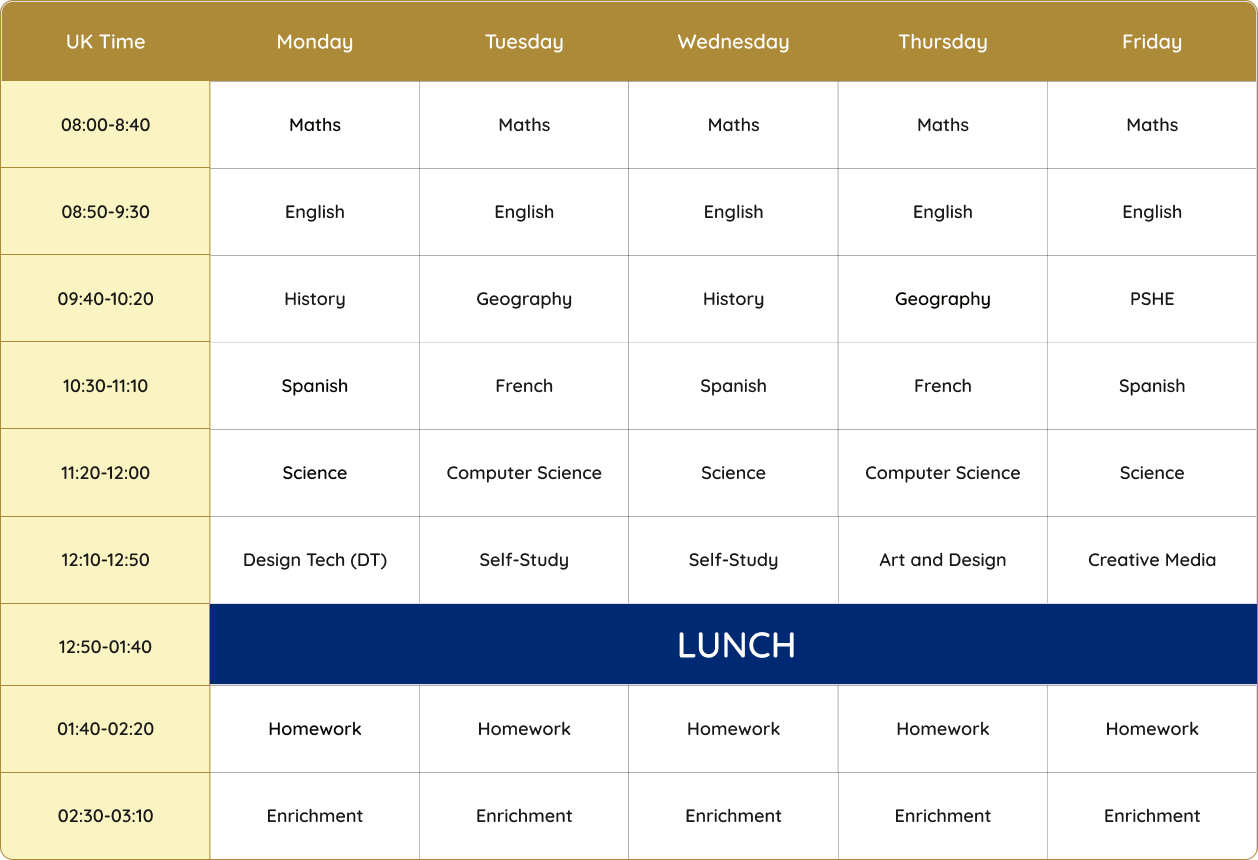 Lower Secondary School experience is structured, focused, and highly interactive. Students join live lessons with subject-specialist teachers who are experts in their fields. The learning is dynamic, with a focus on debate, group projects, and applying knowledge to real-world scenarios. It’s a challenging yet supportive environment designed to build academic independence.