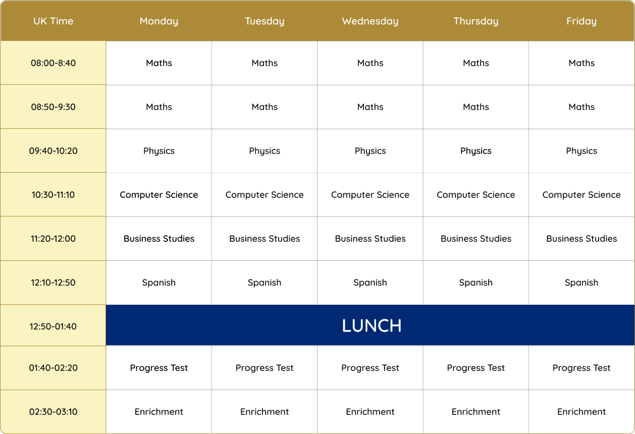 Specific set of subjects taught will depend on the student’s A Level options